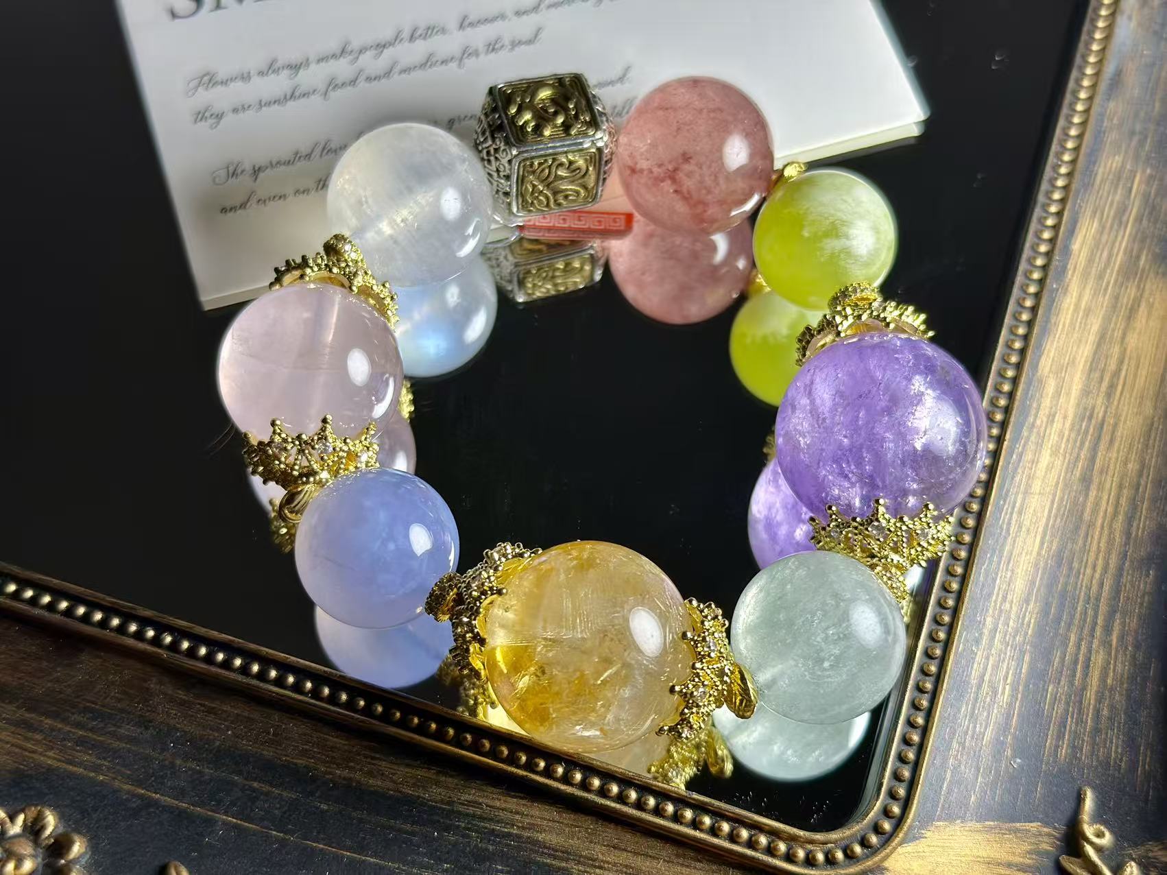 You’ll notice subtle variations in each piece: tiny “strawberry seeds” in the quartz, soft clouds in blue lace agate, golden specks in rutilated quartz. These are nature’s signatures.