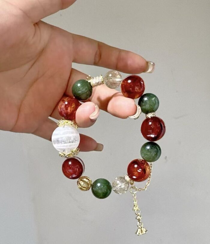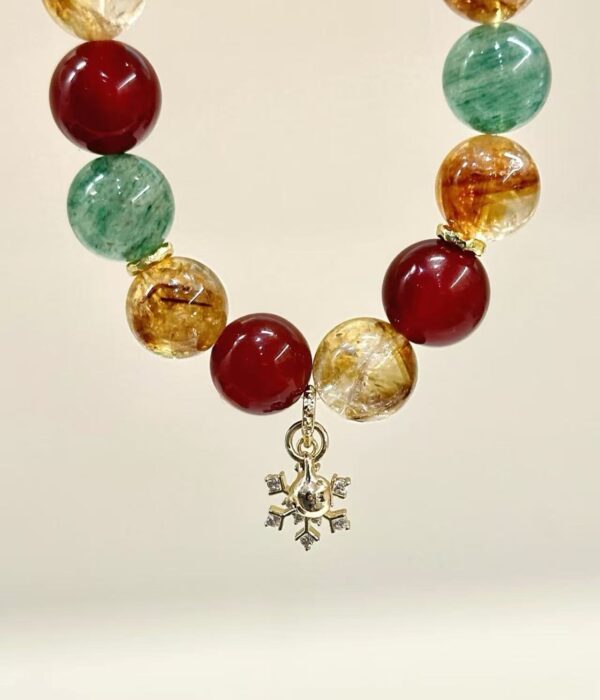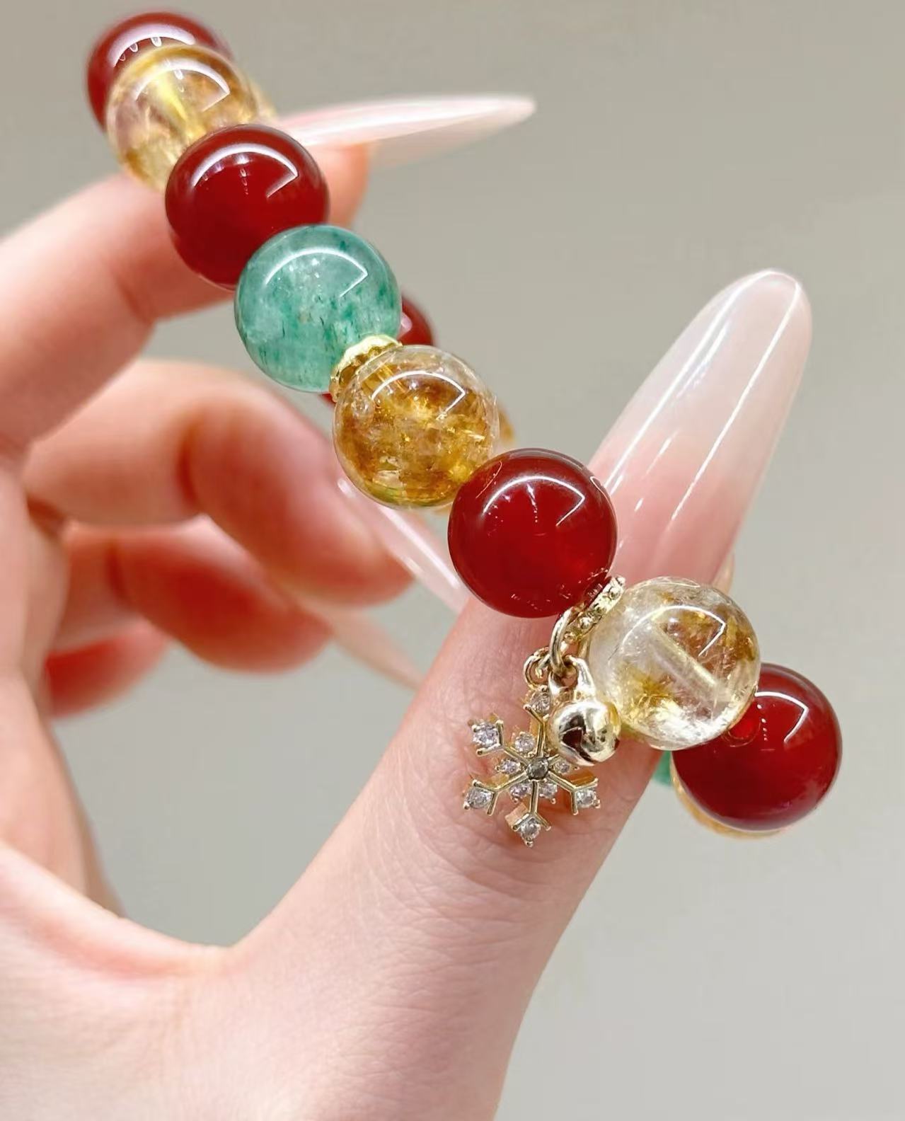 Design Highlights: We employ a carefully curated bead sequence, allowing the green, gold, and red hues to transition harmoniously, like wearing a canvas of classic Christmas colors on your wrist. The addition of exquisitely crafted snowflake zircon clasps or star-shaped spacer beads refracts light like Christmas fairy lights, showcasing festive refinement and joy in every detail.